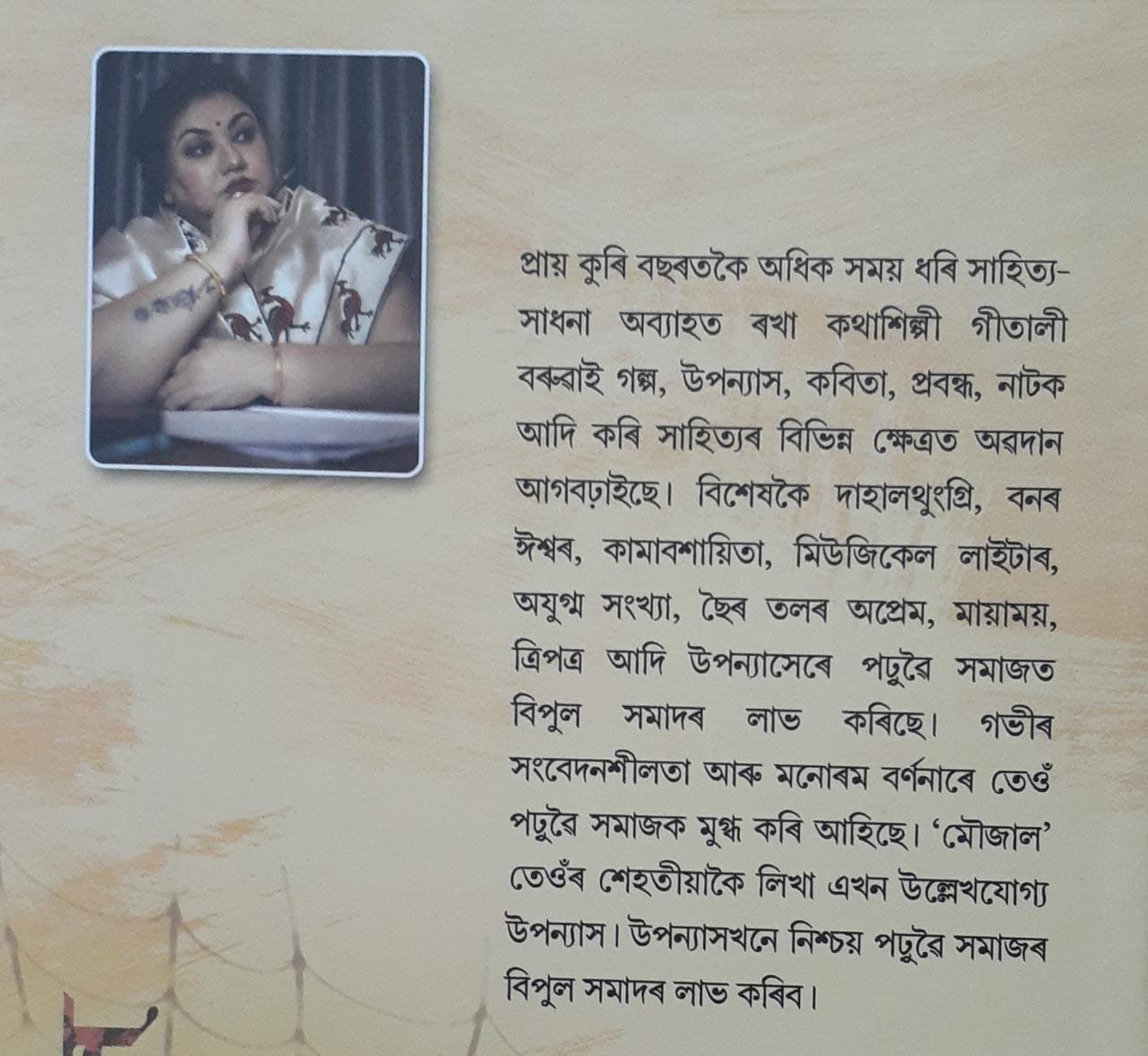 প্ৰতিষ্ঠিত লেখিকা গীতালী বৰুৱাৰ উপন্যাস ‘মৌজাল’ এই বছৰৰ এখন অতি গুৰুত্বপূৰ্ণ উপন্যাস। ‘হানী ট্ৰেপ’ শব্দটোৰ সৈতে আমি কোনো অপৰিচিত নহয়। সাম্প্ৰতিক সময়ত মনৰ গুপুত অভিপ্ৰায়, অসংযমী আকাংক্ষাৰ গ্ৰাসত পৰি বহুলোকেই কিছুমান চলনাময় নাৰীৰ কৱলত পৰাৰ কথা শুনা যায়। ‘হানী ট্ৰেপ’ শব্দটোৰে এইসকল নাৰীৰ কৌশলী জালখনকে বুজোৱা হয়। ‘হানী ট্ৰেপ’ৰ কাষ চপা এটা শব্দ ‘মৌজাল’ৰ জৰিয়তে ঔপন্যাসিক গীতালী বৰুৱাই কিহৰ কাহিনী ক’ব খুজিছে সেয়া সহজেই অনুমান কৰিব পাৰি। চলনাময়ী নাৰীৰ এই কৌশলী জালত ছটফট কৰা ব্যক্তিবিশেষ আৰু তাৰেই পাৰ্শ্বক্ৰিয়া হিচাপে আউল লাগি অহা ঘৰ-পৰিয়ালৰ কাহিনী এই উপন্যাসত আছে। ইয়াত আছে ঐতিহ্য আৰু সৰলতা, প্ৰতিশোধ আৰু সহনশীলতাৰ মাজৰ দ্বন্দ্বৰ সন্মুখীন হৈ আগবাঢ়িছে মৌজালৰ কাহিনী। অকৃত্ৰিম জীৱন উপলব্ধিয়ে সজীৱতা তথা গভীৰতা প্ৰদান কৰা উপন্যাসখনত পৰিয়ালকেন্দ্ৰিক সংঘাত তথা ব্যক্তিস্বাধীনতাৰ দৰে বিষয়েও সবল ৰূপত প্ৰতিভাত হৈ উঠিছে। সংবেদনশীল লেখিকা গীতালী বৰুৱাৰ এই উপন্যাসে উপন্যাস পঢ়াৰ নিৰ্ভেজাল আনন্দ আৰু বিষাদ-বেদনাঘন শিহৰণ প্ৰতিজন পঢ়ুৱৈকে দিব।