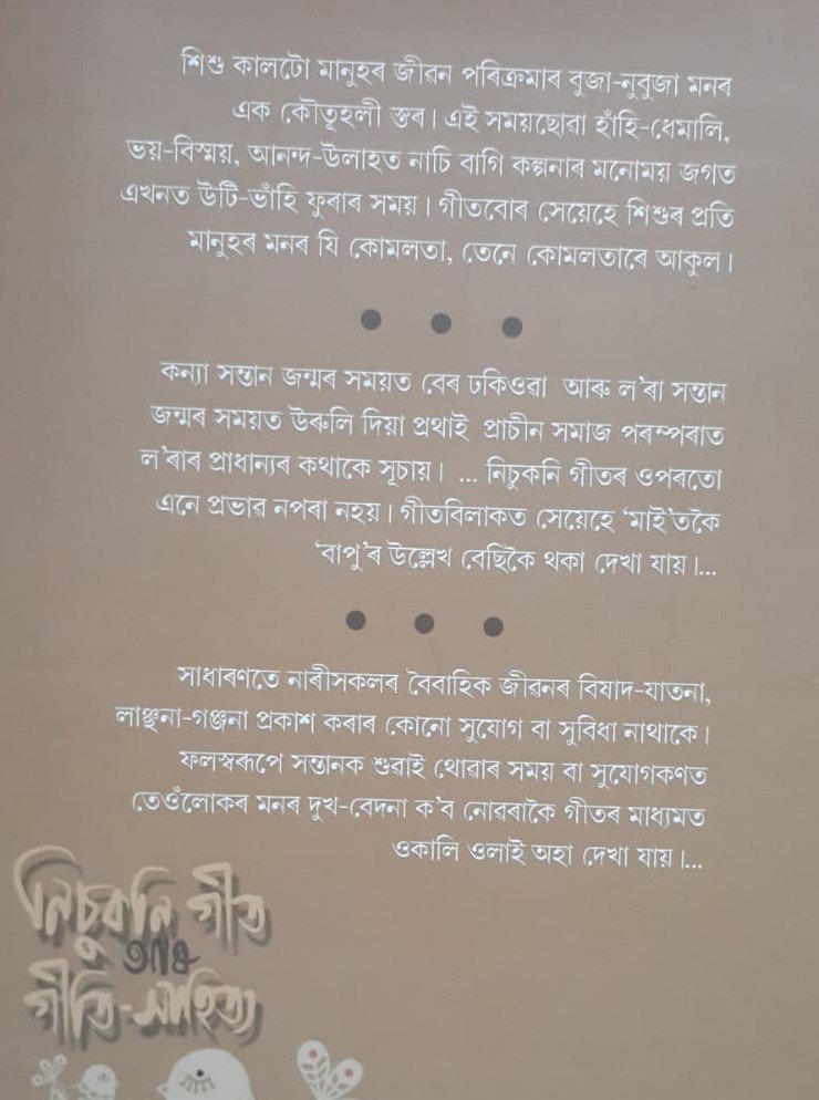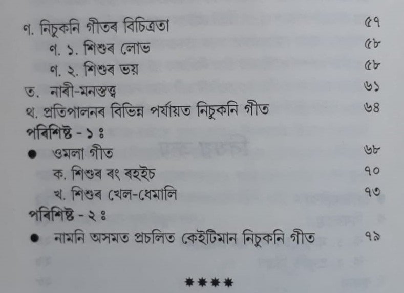 অসমীয়া মৌখিক লোক-সাহিত্যক সমৃদ্ধ কৰি ৰখা নিচুকনি গীত বিষয়ক এখনি অনন্য পুথি–“নিচুকনি গীত আৰু গীতি সাহিত্য”; য’ত নিচুকনি গীতৰ বিভিন্ন দিশ সম্পৰ্কে প্ৰণালীবদ্ধভাৱে আলোচনা কৰা হৈছে।