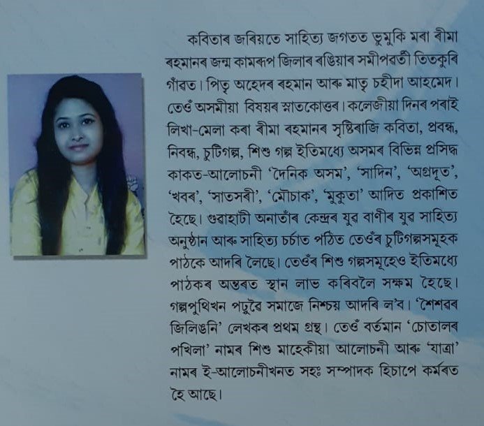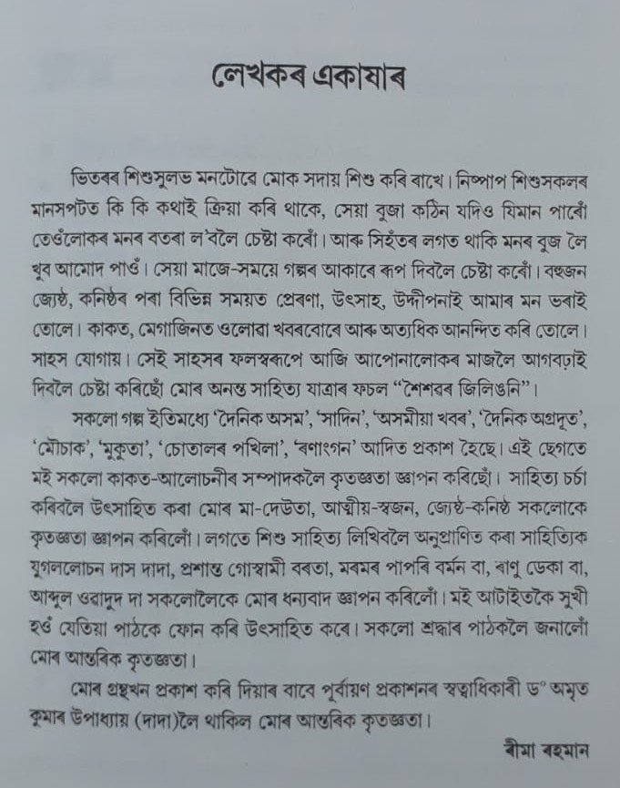 “শিশুৰ বাবে লিখাটো আটাইতকৈ জটিল কাম। শিশুৰ কুমলীয়া মনৰ জগতখনেই বিচিত্ৰ। তেওঁলোকৰ মনোজগতখনত ভালদৰে বিচৰণ কৰি লেখাবোৰহে প্ৰকৃততে শিশু সাহিত্য।… শিশুৰ মনোজগতখনৰ বিষয়ে একান্তভাৱে অধ্যয়ন উপলব্ধি কৰি ৰীমাই গল্প লিখা আৰম্ভ কৰি এতিয়া প্ৰথমখন শিশু গল্প সংকলন প্ৰকাশৰ পথত আগবাঢ়িছে। প্ৰায় ১৫ টা গল্পৰে এই সংকলনখন সজাইছে। পাণ্ডুলিপিটো চকু ফুৰাই মই দৃঢ়তাৰে ক’ব বিচাৰোঁ যে, ৰীমাই প্ৰতিটো গল্পত শিশুৰ বিচিত্ৰ মনোজগতৰ গভীৰত সোমাই পৰিবলৈ সক্ষম হৈছে। প্ৰতিটো গল্পত নৈতিক শিক্ষা আছে। শিশুৰ মানসিক আৰু বৌদ্ধিক বিকাশৰ বাবেও তেওঁ গল্পবোৰৰ মাজেৰে একোটা বাৰ্তা প্ৰেৰণ কৰিছে। ”