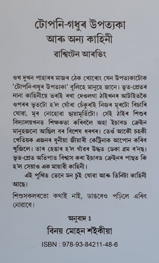 TOPANI GADHUR UPATYAKA ARU ANYA KAHINI : ASSAMESE TRANSLATION OF WASHINGTON IRVING’S THE LEGEND OF THE SLEEPY HOLLOW AND THREE OTHERS STORIES BY : BINOY MOHAN SAIKIA IN THE KALAJOYEE SAHITYA SERIES