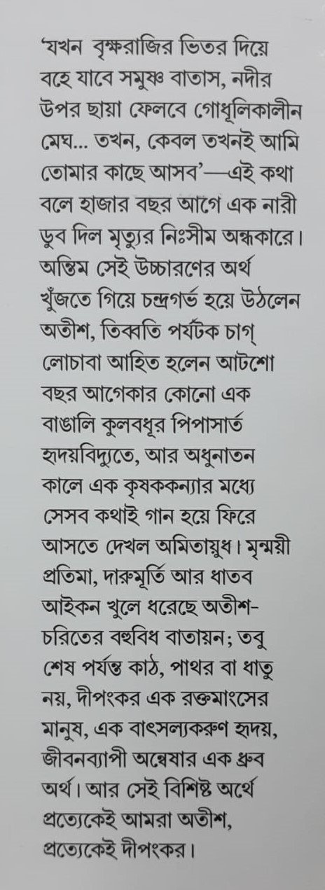 ‘অতীশ দীপংকরের জীবনের উপর রচিত বাংলাভাষার প্রথম প্রামাণ্য উপন্যাস। হাজার বছরের প্রাচীন ইতিহাসের সঙ্গে আজকের পৃথিবীও জড়িয়ে আছে এ উপন্যাসের আখ্যানভাগে। সময়ের গলিপথে বিভিন্নযুগের চরিত্রদের সাক্ষাৎ হয়েছে আলোয়াঁধারিময় পরিবেশে – অতীশের সঙ্গে জড়িয়ে গেছেন তিব্বতি চাগ্ লোচাবা, আটশো বছর আগেকার রহস্যময়ী কুলবধূ স্বয়ংবিদা, আজকের বাংলাদেশের কৃষক অনঙ্গ দাস ও তাঁর মেয়ে জাহ্নবী, শহর কলকাতার অনুসন্ধিৎসু যুবক অমিতায়ুধ এবং উপন্যাসের কল্পিত লেখক শাওন। তিন যুগের তিন নারীর প্রণয়কথার অনুষঙ্গে এ উপন্যাস এক অনন্য অতীশ-অনুসন্ধানের ইতিবৃত্ত।